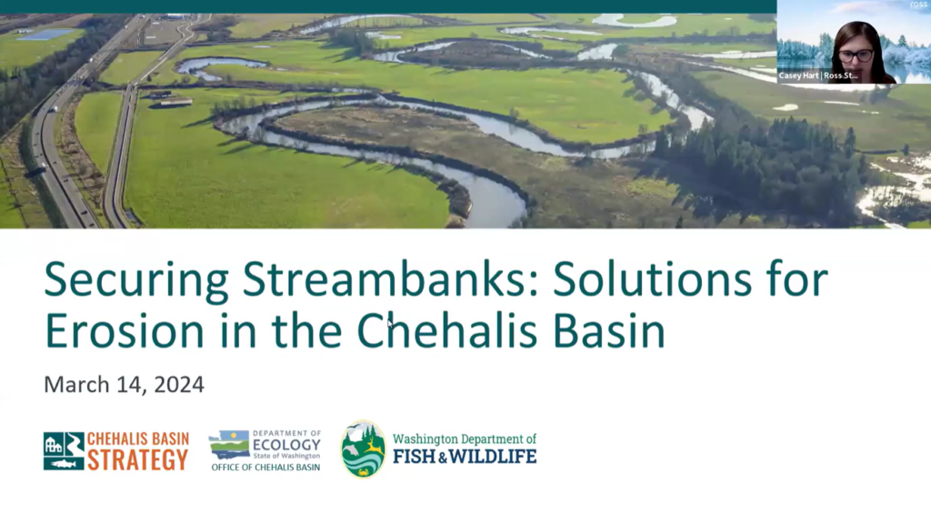 Erosion rates are a top concern throughout the Chehalis Basin. From farmland to private residences, community infrastructure to businesses, unnatural rates of streambank erosion threaten the safety and health of both communities and river systems. This one-hour community webinar, hosted by the state Department of Ecology’s Office of Chehalis Basin and the Washington Department of Fish and Wildlife, covered: (1) Lessons learned from the field, (2) What to do if you have streambank erosion on your property, and (3) The Office of Chehalis Basin’s new Erosion Management Program