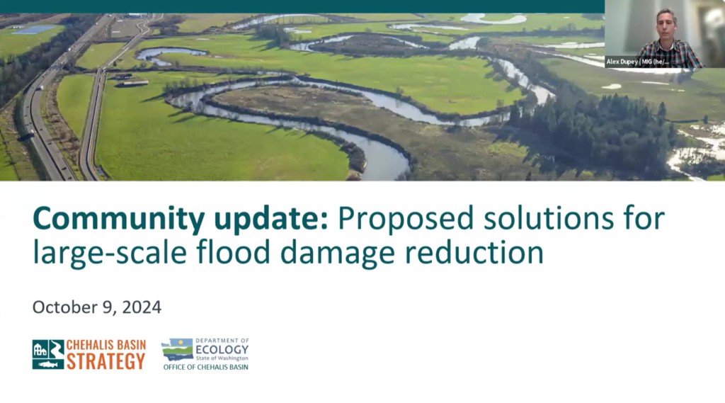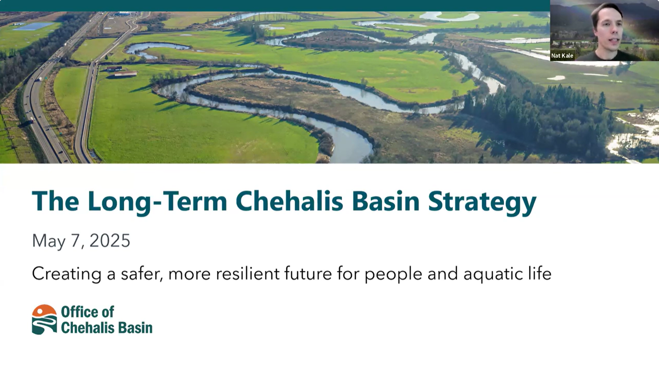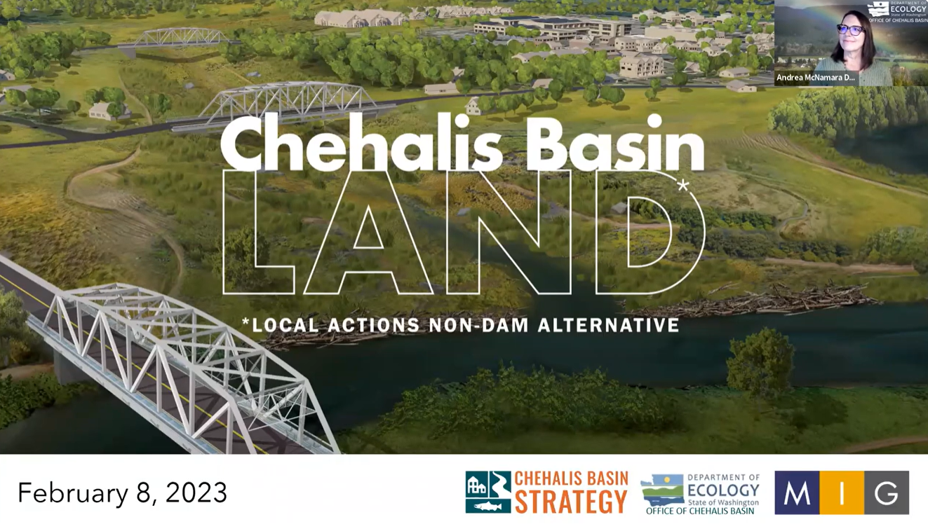 The Department of Ecology’s Office of Chehalis Basin (OCB) and the independent Chehalis Basin Board oversee the funding and implementation of the Chehalis Basin Strategy—dedicated to protecting Basin communities from flood damage, restoring habitat for aquatic life, and ensuring the Basin is safe and prosperous for people, fish and wildlife for generations to come. The Chehalis Basin Board is collaborating with its network of partners to design the projects and policies that will create net improvement for people and aquatic life in the Chehalis Basin over the next 30+ years. This webinar provides an update about the solutions the Board is currently considering to reduce damage from major and catastrophic floods. It includes updates on: (1) Next steps in the process to develop the projects and policies for the long-term Chehalis Basin Strategy, (2) The proposed flow-through flood control dam on the Chehalis River near Pe Ell, proposed by the Chehalis River Basin Flood Control Zone District, and (3) The Local Actions Non-Dam Alternative (LAND) effort to develop a suite of actions the Board will consider to reduce flood damages in the upper Basin, with or without building a flood control dam on the Chehalis River.