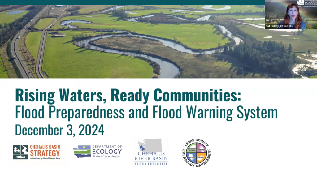 The Department of Ecology’s Office of Chehalis Basin (OCB) and the independent Chehalis Basin Board oversee the funding and implementation of the Chehalis Basin Strategy—dedicated to protecting Basin communities from flood damage, restoring habitat for aquatic life, and ensuring the Basin is safe and prosperous for people, fish and wildlife for generations to come. Recent wet, stormy weather is a reminder the upcoming 2024-25 flood season is coming soon and being ready is essential for safeguarding lives and livelihoods in the Chehalis River basin. The webinar brings together experts and community leaders to share practical tips on how to protect your home and community, including measures you can take to stay safe before, during and after a flood. The event will include speakers from OCB, Lewis County Emergency Management and the Chehalis River Basin Flood Authority, and covers (1) How to use the Flood Authority’s flood warning system, (2) Role of county emergency responders during floods, (3) Ways to floodproof your home and belongings, (4) What to do when a flood occurs, and (5) Flood Insurance 101.