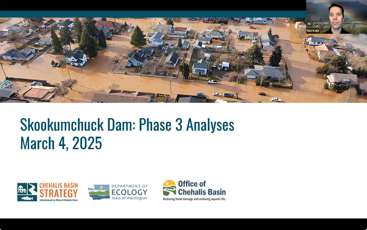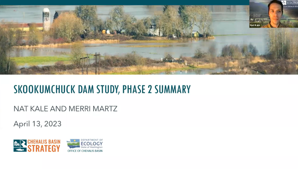 How can flood reduction and fish habitat restoration work together? This reocrding of “Skookumchuck Dam: Exploring the Future of Flood Management & Fish Passage”, is one-hour webinar where experts will discuss key findings from the latest Skookumchuck Dam Phase 3 Analysis. This free webinar, hosted by the Department of Ecology’s Office of Chehalis Basin (OCB), explores how potential modifications to TransAlta’s Skookumchuck Dam could reduce flood damage, improve fish passage or achieve a balance between both. This webinar covers: (1) Overview of the alternatives developed in the Skookumchuck Dam – Phases 1 and 2 studies, (2) The new information about fish survival and storing and piping water in the latest Skookumchuck Dam Phase 3 analysis, (3) How flood reduction, fish passage and water rights influence each other, and (4) What we’ve learned and what we still don’t know.